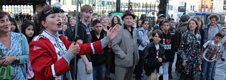Our outdoor performances extend the work that we do to the streets, and to various public settings. We often lead our audiences to a venue, promenading them through the streets, or escorting them on a bus ride. Working outdoors gives us the flexibility to intervene in performance events in Brighton and London, as well as various charitable events and community projects. We also have a site-seeing comedy tour, in which our audiences are driven through the streets of Brighton on the Lemon Bus, exploring everything odd and improbable about the city. In September 2011 we were commissioned by the Ludwig Contemporary Art Museum to create Maalot, a site responsive performance on the sculpture site of Dani Karavan in Cologne, Germany. (Photos by Claire Wearn, Dan Childs, Paul Kondritz and Jason Wen)